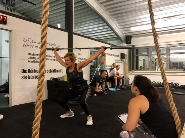 Den häufigsten Satz, den ich über Elke in der Box höre ist folgender: „Im Alter so fit zu sein wie Elke, das sollte das Ziel sein!“ Und das stimmt. Ich kenne keine andere Frau in Elkes Alter, die noch mit Hantelstangen trainiert und jedes Workout so durchziehen kann. Das Open WOD der vergangenen Woche, 17.3, beinhaltete eine der schwierigsten und komplexesten Bewegungen im CrossFit Sport – den Squat Snatch. Bei dieser Bewegung muss alles im Körper zu 100 Prozent funktionieren. Daher gibt es auch viele junge Leute, die nicht eine Wiederholung sauber ausführen können. Elke hat uns in 17.3 gezeigt, dass wenn man bereit ist in seinen Körper zu investieren, auch komplexe Bewegungen wie der Squat Snatch bzw. Overhead Squat, möglich sind.